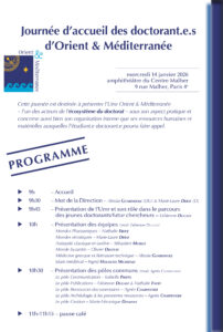 Afin de faciliter le début de thèse, une réunion d’informations sur le parcours doctoral au sein du laboratoire Orient & Méditerranée (environnement de travail, droits et devoirs, personnes ressources, outils…) est proposée aux doctorants comme aux nouveaux entrants.