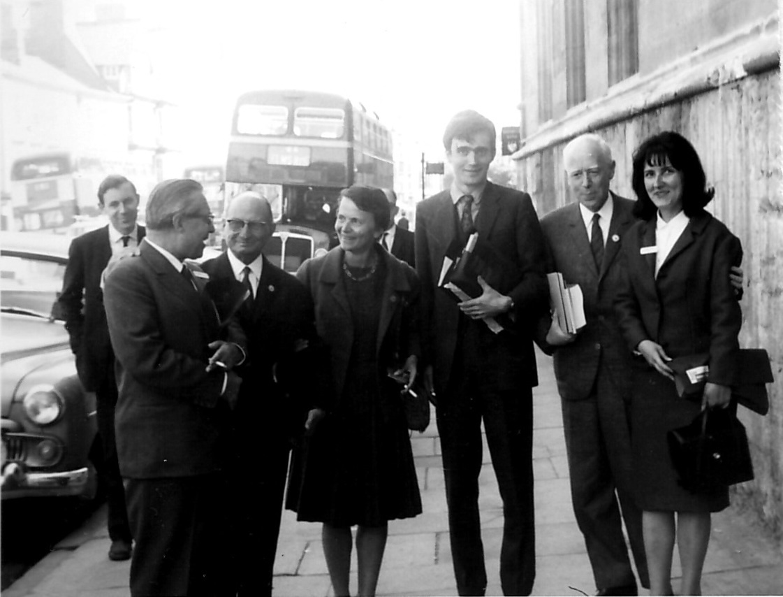Colloque international d’études byzantines, Oxford, 1966 © Collège de France (de gauche à droite, deux inconnus, Dionysios Zakythinos, Hélène Ahrweiler, James Howard Johnson, Georges Ostrogorsky, Hélène Kaplan)