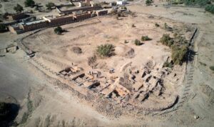 Vue aérienne du village d’Azougui soulignant la faible densité de son bâti, avec au premier plan la parcelle de la qasba, où se développent les fouilles depuis janvier 2025 (cliché MAAT)
