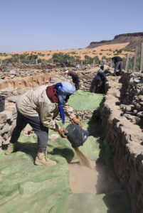 Mais l’objectif principal du programme Azougui dépasse de loin l’échelle locale et ses résultats sont attendus à une échelle plus vaste, celle de l’histoire transsaharienne. En effet, à l’avenir, en comparant les connaissances produites à Azougui, l’ambition de ce projet est d’insérer ces données locales à une réflexion d’ordre régional, incluant le Sahara entier et ses rives maghrébines et sahéliennes. L’enjeu sera de replacer l’histoire de Teyart dans l’histoire almoravide mais aussi, et surtout, dans le processus d’islamisation du continent africain, dans le parcours de diffusion de l’agriculture oasienne, dans le cycle mondial de la domestication du palmier-dattier et du dromadaire, ou encore dans les dynamiques de valorisation des paysages sahariens et dans l’histoire climatique et environnementale du continent. En raisonnant de manière macroscopique à partir du cas d’Azougui, l’ambition finale de ce programme est de penser le Sahara comme un espace culturel autonome et cohérent, traversé par ses propres dynamiques, et relié aux mondes méditerranéens et sub-sahariens par des passerelles commerciales, intellectuelles et techniques qui le placent en position d’entité historique à part entière.